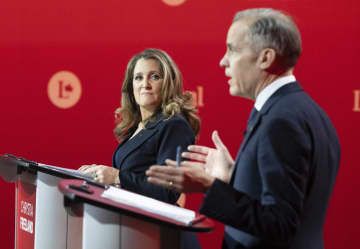 カナダ自由党の討論会でカーニー元カナダ銀行総裁(右)の話を聞くフリーランド前副首相=2月25日、カナダ・モントリオール(AP=共同)