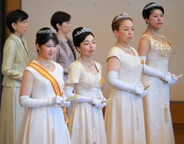 「新年祝賀の儀」に臨まれる天皇、皇后両陛下の長女愛子さま、三笠宮家の長女彬子さま、次女瑶子さま、高円宮家の長女承子さま=2024年1月、宮殿・松の間