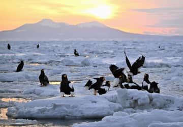 世界自然遺産の北海道・知床を望む羅臼町沖に越冬のため飛来し、朝日を浴びながら流氷の上で羽を休める国の天然記念物オオワシ。大きな翼を広げて優雅に飛ぶと、観光船の乗客が一斉にカメラを向けた=5日早朝