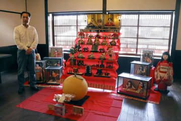 石川県輪島市の「中浦屋」で展示が始まった香川県東かがわ市引田のひな人形と中浦政克さん=14日午前