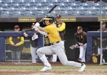 「スプリング・ブレークアウト」のパドレス戦で、8回に代打で出場し、遊ゴロで出塁するアスレチックスとマイナー契約の森井=ピオリア(共同)