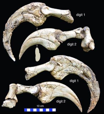 「2本指の恐竜」新種化石を発見 ゴビ砂漠で北大グループ Newsfrom Japan 科学 2025.03.26 00:13 / 2025.03.26 00:17 更新 English 日本語 简体字 繁體字 Français Español العربية Русский 新種の2本指の恐竜「デュオニクス・ツクトバアタリ」の指と爪の部分の化石。下2つは上2つの反対側の面(小林快次北海道大教授提供)北海道大の小林快次教授らの研究グループは26日、モンゴルのゴビ砂漠で2012年に見つけた恐竜の爪など...記事全文を読む(外部サイト画面を表示します) 共同通信ニュース