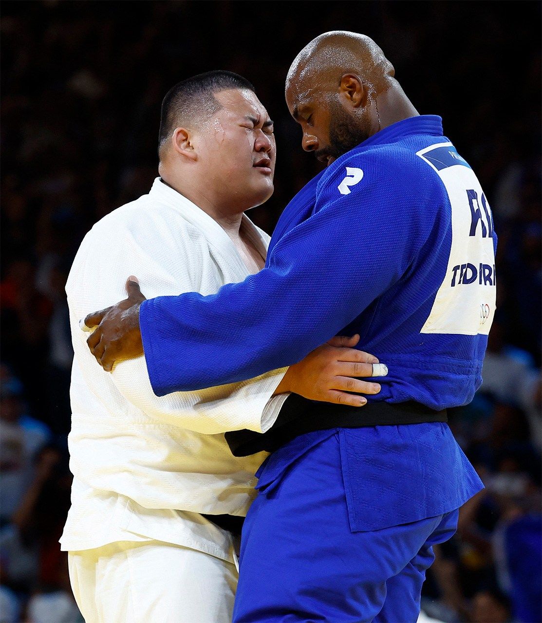 柔道混合団体決勝代表戦でフランスのテディ・リネール選手(右)に敗れ、健闘を称え合う斉藤立選手。日本は銀メダル(ロイター)