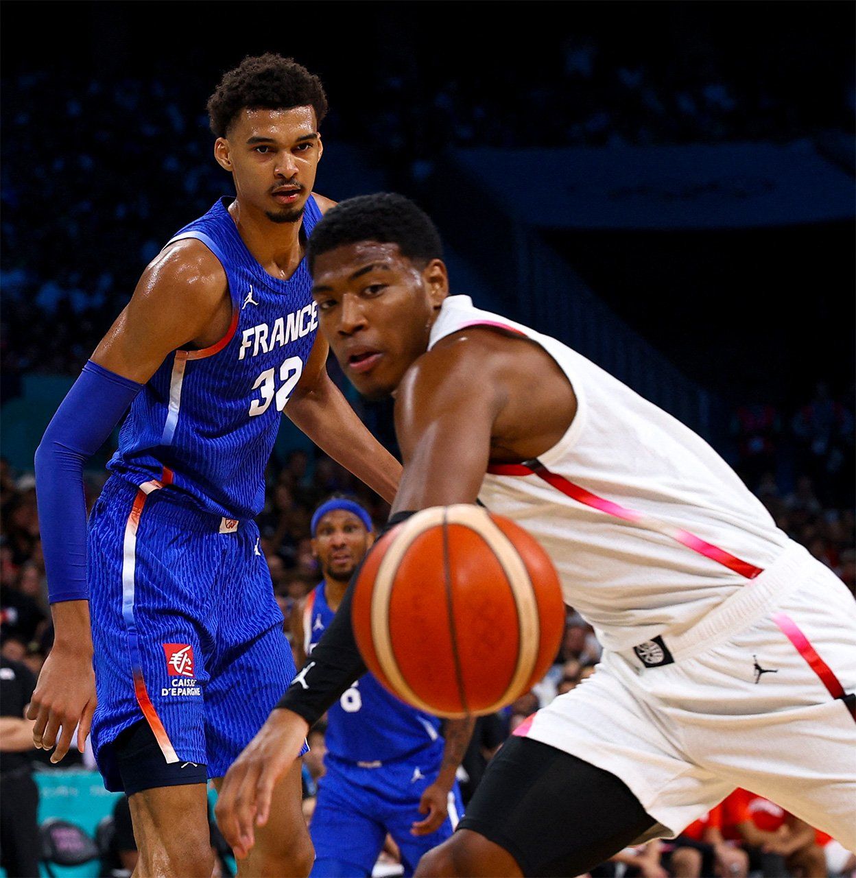 バスケットボール男子予選リーググループBのフランス戦で激しい競り合いを見せた八村塁選手(右)。八村選手はこの試合で負傷し、チームを離脱した(ロイター)