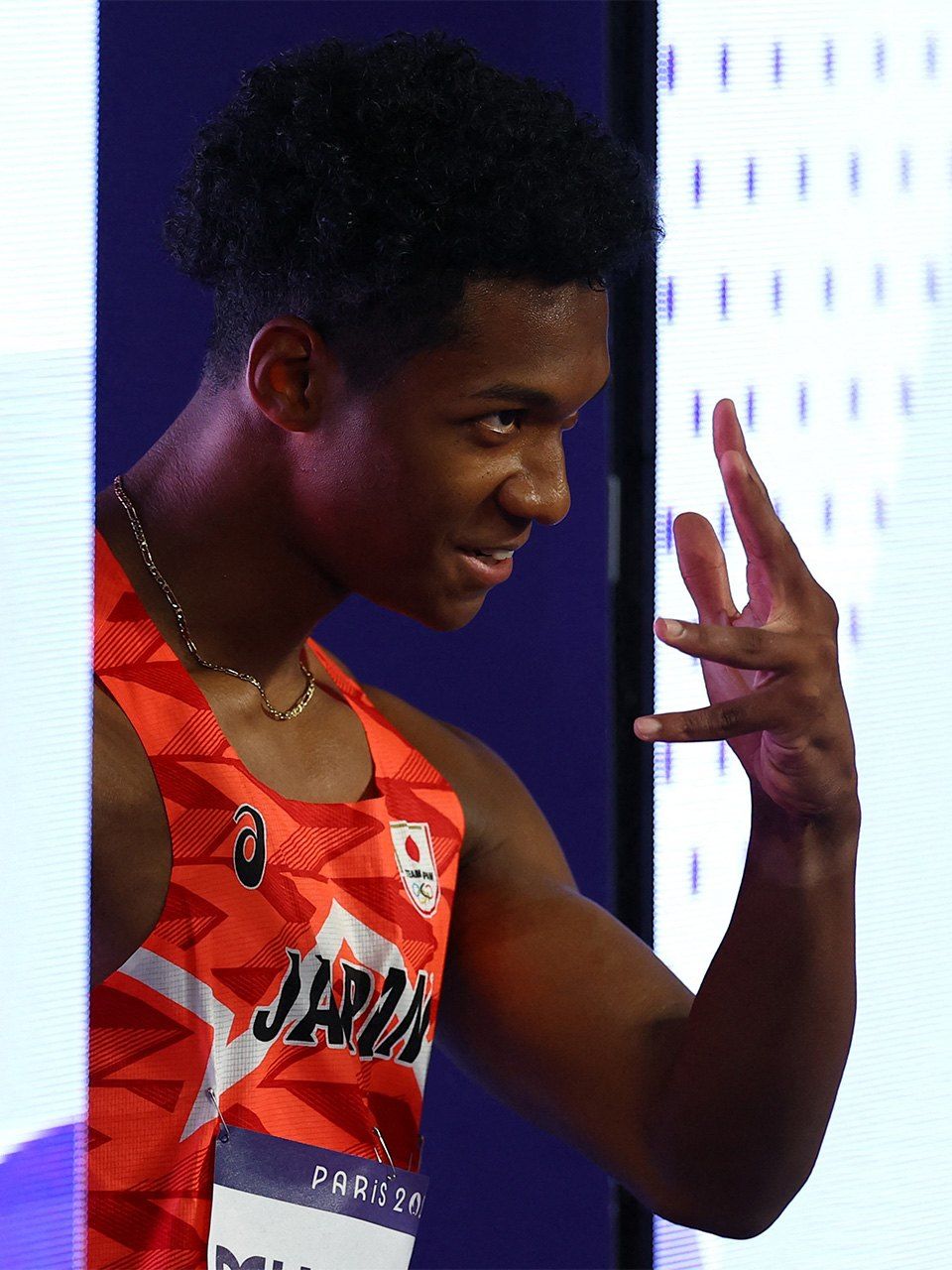 男子110メートル障害決勝のレース前、人気漫画にあやかった「ジョジョ立ち」のポーズを決めて入場した村竹ラシッド選手(ロイター)