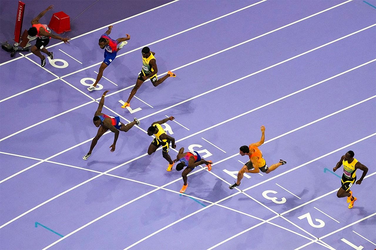 陸上男子110メートル障害決勝のゴール。5着となった村竹ラシッド選手は左最奥の9レーンを駆け抜けた(ロイター)