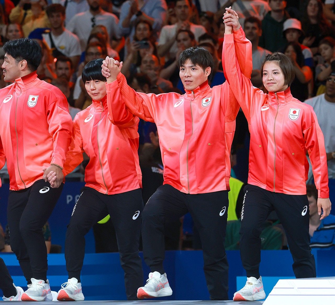 柔道の混合団体の表彰式で表彰台に立つ(右から)阿部詩選手、一二三選手ら(時事)