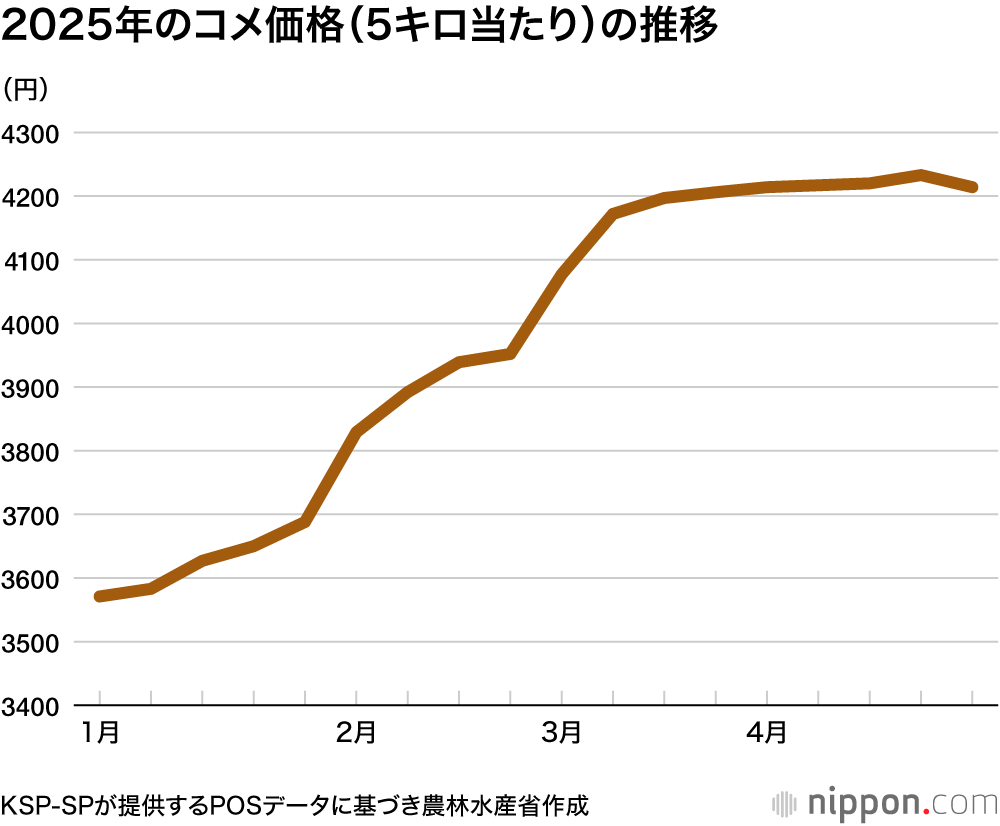 ただ、放出された備蓄米は小売りまで十分に行きわたっていない状況で、市場価格を押し下げるパワーは弱く、前年の同時期の2倍前後での推移が続いている。 政府は4月下旬に備蓄米10万トンを追加入札し、5~7月も毎月の放出する方針を明らかにしている。