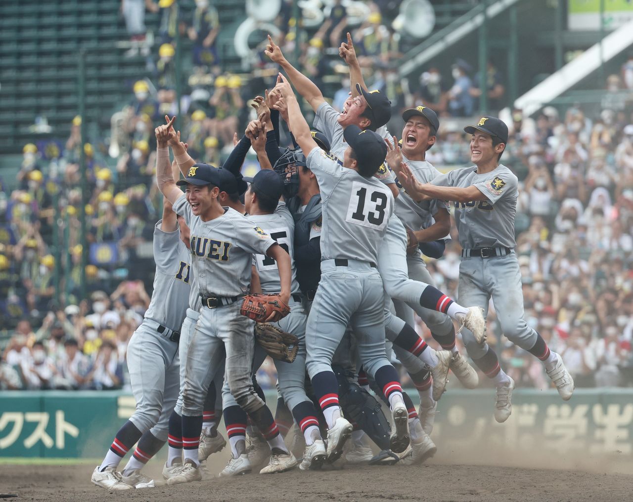 東北勢として初優勝を果たし、喜ぶ仙台育英ナイン=2022年8月22日、甲子園(時事)
