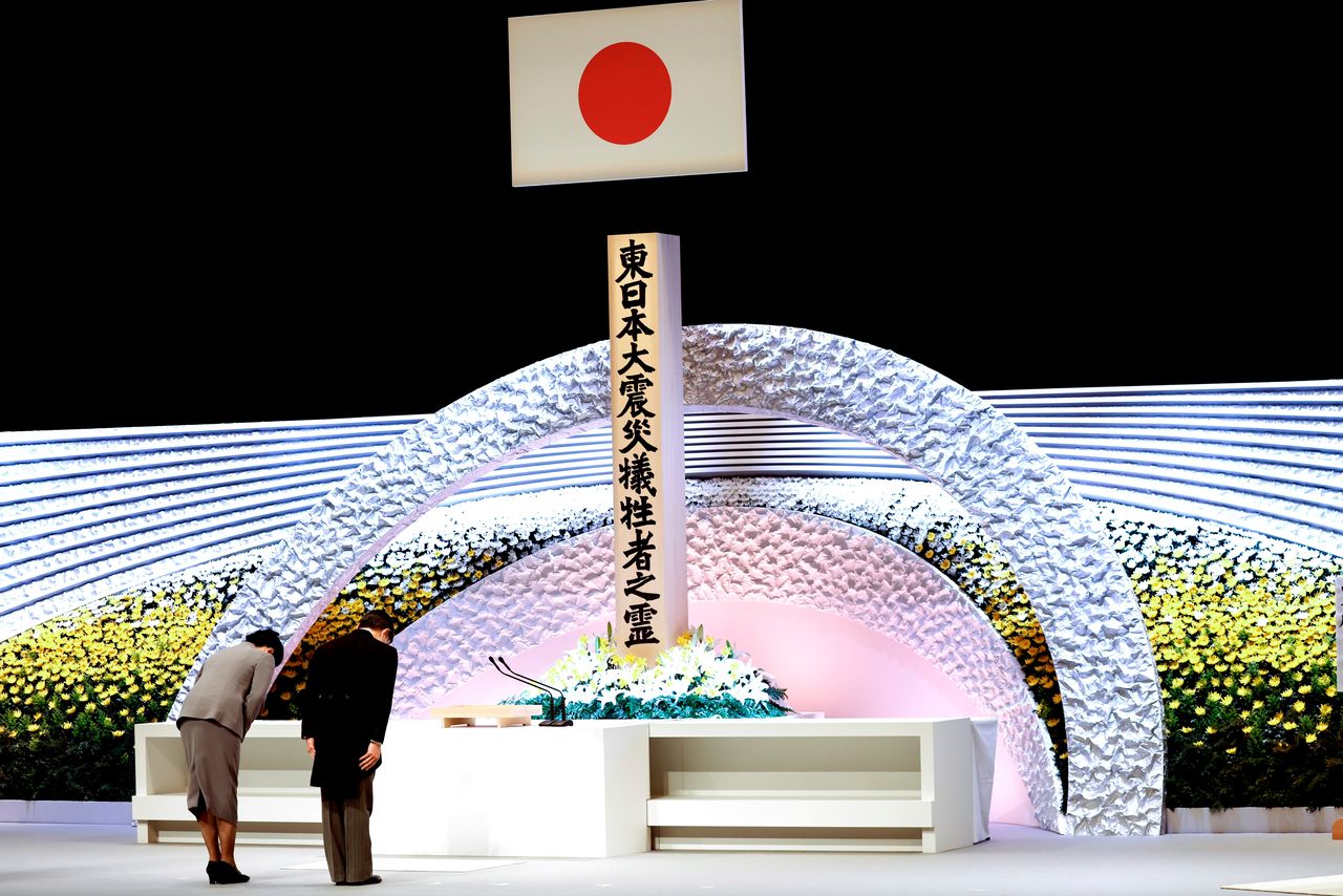 ほぼ同じ時刻に政府が東京の国立劇場で開いた追悼式典には、天皇・皇后両陛下が出席した。天皇陛下は「困難な状況にある人々が、誰一人取り残されることなく、1日でも早く平穏な日常の暮らしを取り戻すことができるように、復興の歩みが着実に実を結んでいくよう、これからも私たちみなが心を合わせて、被災した地域の人々に末永く寄り添っていくことが大切であると思います」とお言葉を述べた。