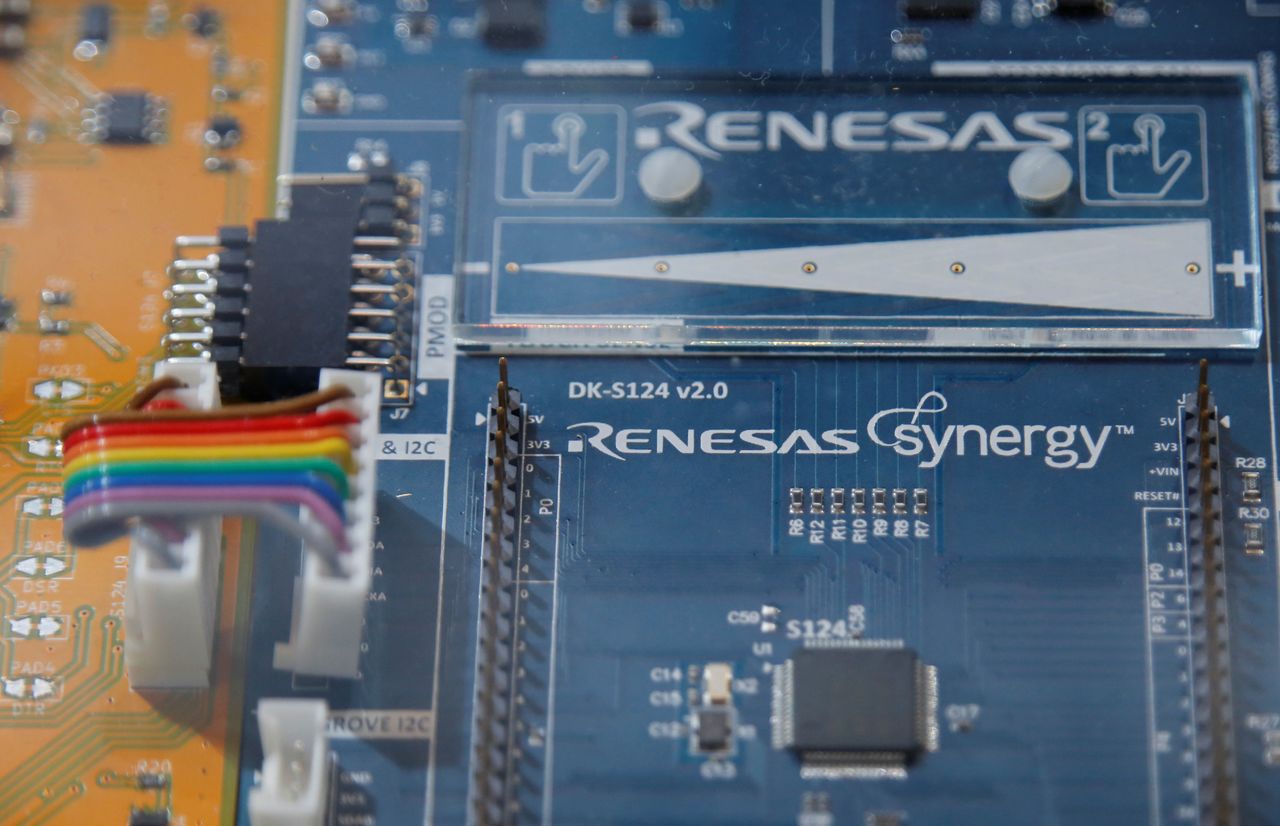 3月22日、ルネサスエレクトロニクスは大幅に続落し、3%超安での推移となっている。一時5.37%安となった。19日に同社の那珂工場(茨城県ひたちなか市)で発生した火災が嫌気されている。写真は2017年4月、東京でルネサスが開いた発表会で撮影(2021年 ロイター/Toru Hanai)