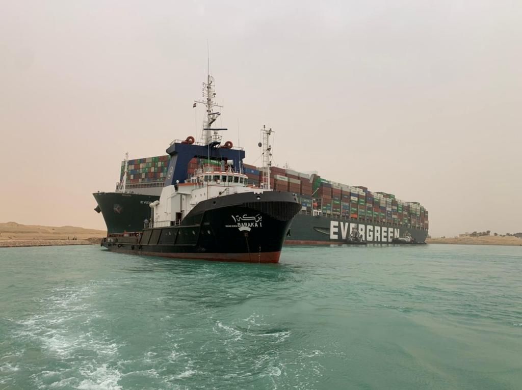 スエズ運河当局が掲載した画像によると、エバーギブンは運河を斜めにふさいでおり、周りではタグボートや掘削機が作業にあたっている。