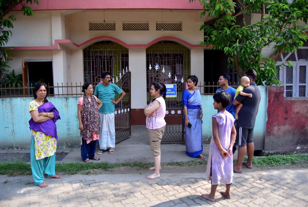 4月28日、米地質調査所(USGS)によると、インド北東部アッサム州で28日、マグニチュード6.0の地震が発生した。写真は地震のあと、家から外に出た住民たち。インドのアッサムで撮影(2021年 ロイター/Anuwar Hazarika)