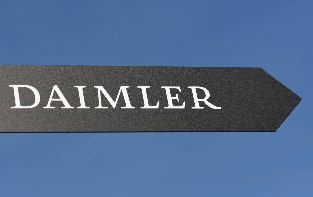 5月21日、ドイツ自動車大手ダイムラーのトラック・バス部門、ダイムラー・トラックのマーティン・ダウム最高経営責任者(CEO)はロイターに対し、排出量実質ゼロの燃料電池トラックへの移行に伴い、向こう15年で欧州のトラックエンジン工場の雇用は半減すると表明した。写真はダイムラーのサイン。独ハノーバーで2016年9月撮影(2021年 ロイター/Fabian Bimmer)