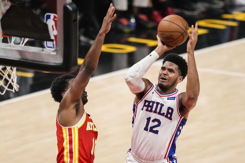 NBAプレーオフ、東カンファレンス準決勝ではセブンティシクサーズがホークスを127─111で下し、2勝1敗とした。写真右はシクサーズのトバイアス・ハリス(2021年 ロイター/Dale Zanine-USA TODAY Sports)