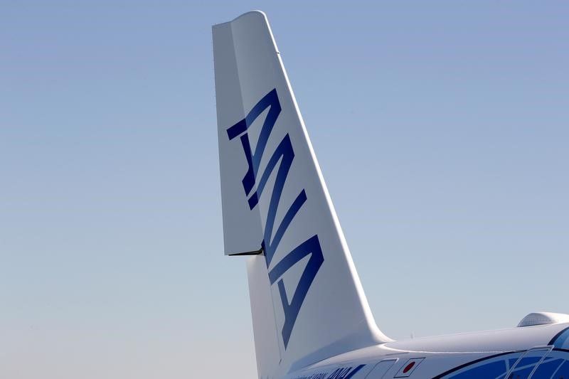6月17日、ANAホールディングスの宮田千夏子執行役員はロイターとのインタビューで、2050年のカーボンニュートラル実現のため、持続可能な航空機用燃料(SAF)の安定供給で新たな提携を模索する意向を示した。写真はANA機。仏トゥールーズで2019年3月撮影(2021年 ロイター/Regis Duvignau)