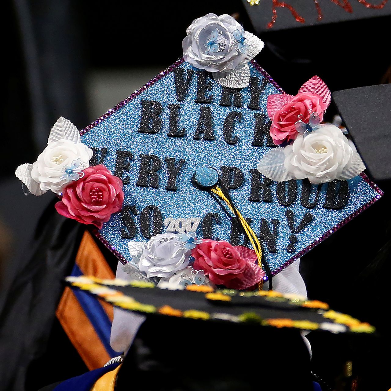 6月17日、米国の企業がブランドやビジネス戦略の要としてダイバーシティー(多様性)やインクルージョン(包括性)を掲げる中、米国の黒人労働者の収入が白人労働者よりも低い状態がなお続いていることが、17日発表された米コンファレンス・ボード(CB)のリポートで明らかになった。写真は大学の卒業生の帽子。ニューヨークにある大学の卒業式で2017年6月撮影(2021年 ロイター/Carlo Allegri)