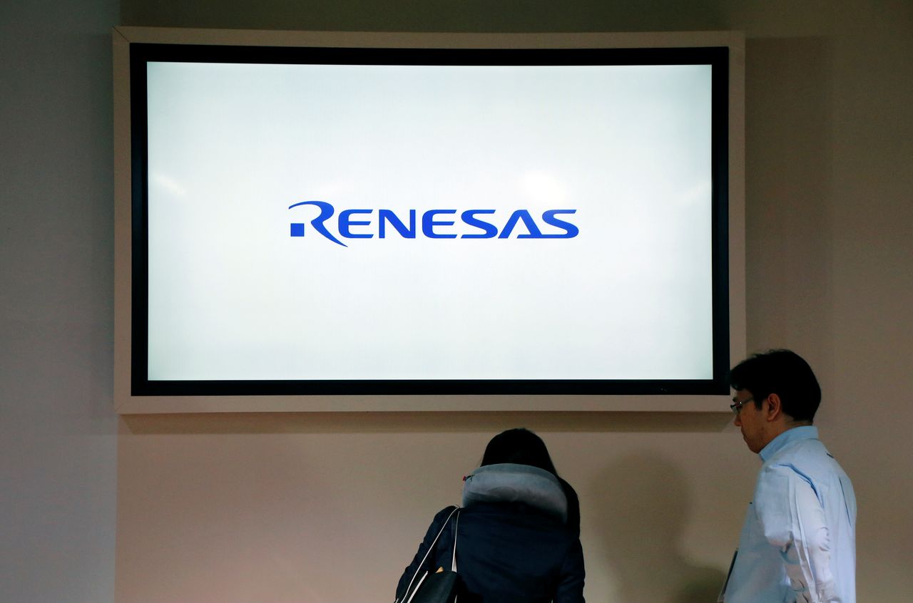 ルネサスエレクトロニクスは25日、火災で一時生産を停止した茨城県の那珂工場について、24日夜に火災前の生産水準を回復したと発表した。写真は、同社のロゴを映した会見会場。2017年4月11日に都内で撮影。(2021年 ロイター/Toru Hanai)
