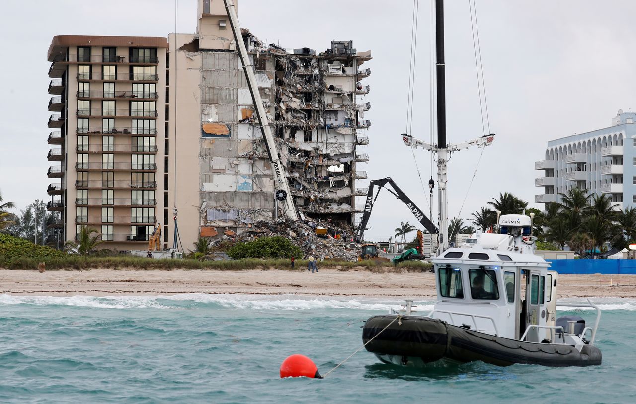 6月30日、米フロリダ州マイアミ市近郊のサーフサイドで24日に起きた12階建てマンション崩落で、マイアミ・デード郡のトップは、新たに4人の遺体が収容されたと発表した。これにより、死者は計16人になった。写真は同日、崩落現場近くで(2021年 ロイター/Joe Skipper)