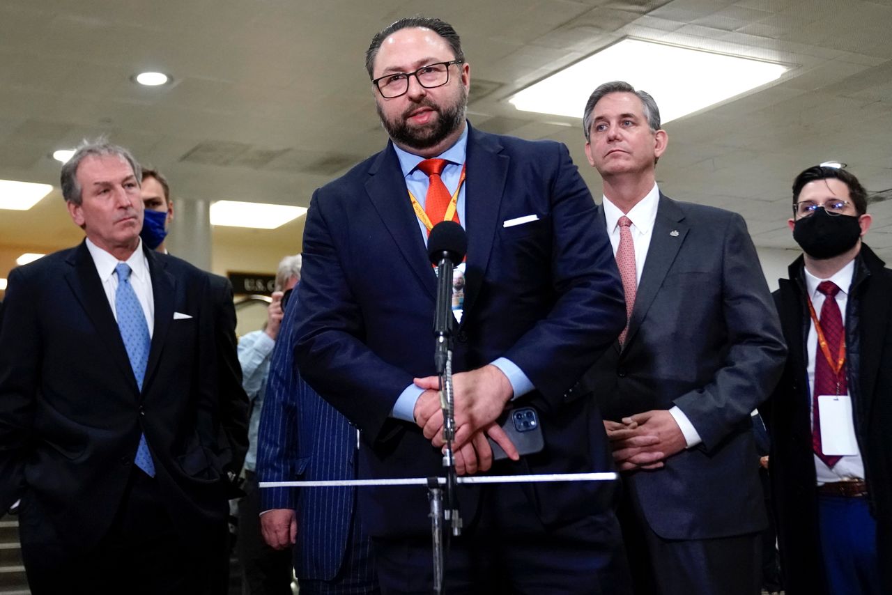 トランプ米前大統領の元顧問、ジェイソン・ミラー氏が1日、ソーシャルメディアサイト「GETTR」を立ち上げたと発表した。写真の中央がミラー氏。2021年2月13日にワシントンで撮影。(2021年 ロイター/Erin Scott)