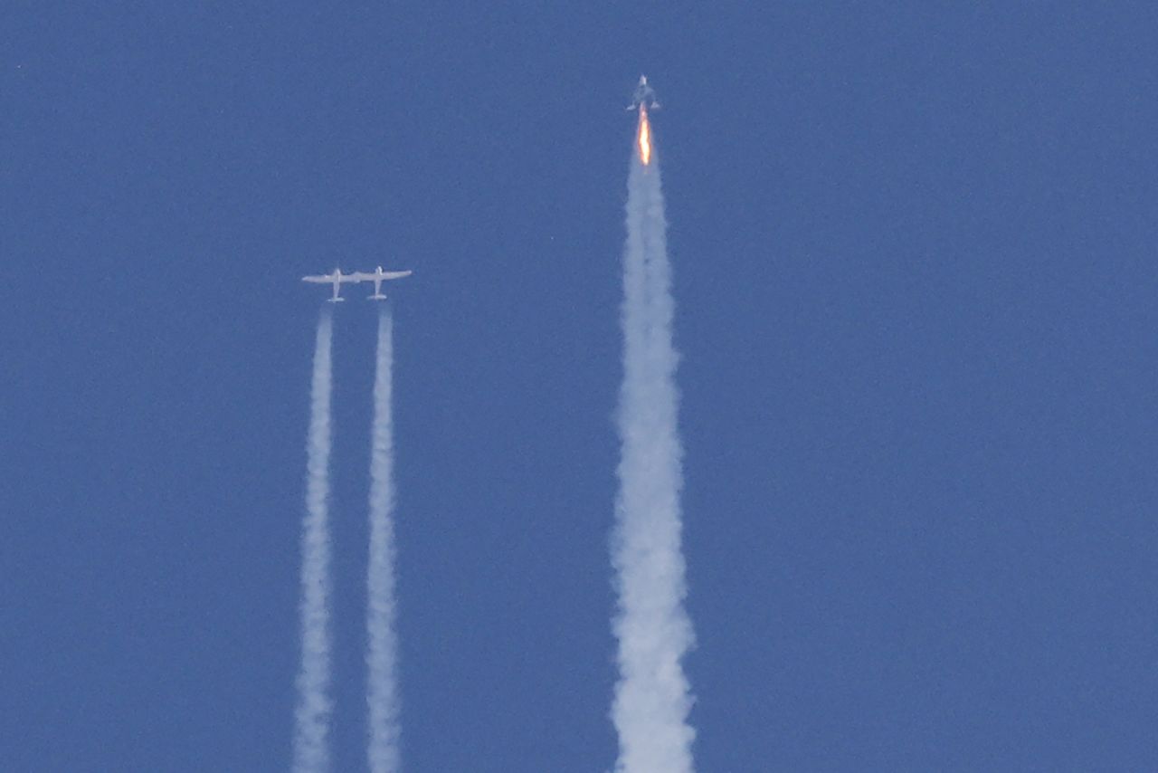 7月12日 宇宙旅行を目指す米ヴァージン・ギャラクティックは12日、最大5億株の普通株式を売り出すと発表した。同社は前日、創業者リチャード・ブランソン氏の同乗で、宇宙空間への初の有人テスト飛行に成功したばかり。写真は創業者リチャード・ブランソン氏を乗せ宇宙空間を目指す宇宙船。7月11日、ニューメキシコ州で撮影(2021年 ロイター/Joe Skipper)