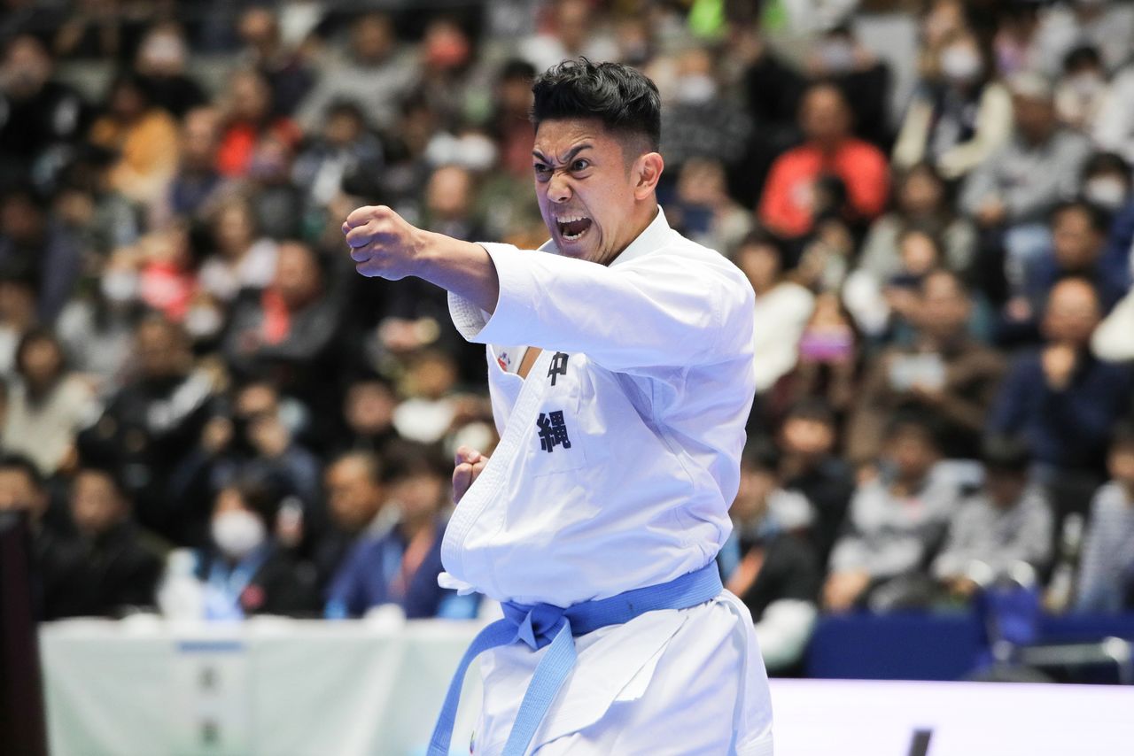 日本武道の空手が、正式種目として初めて五輪大会に登場する。1964年の前東京大会を機に空手界が統一団体を結成、それ以来、およそ60年にわたる悲願がかなった晴れ舞台だ。写真は世界大会3連覇中の形の王者、喜友名諒選手。2019年12月、群馬県の高崎アリーナで撮影(2021年 時事通信)