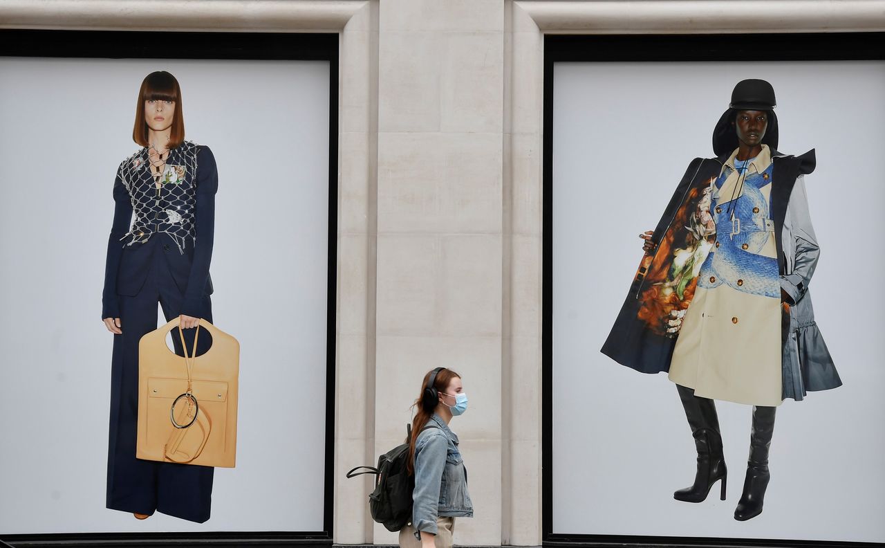 7月16日、英バーバリーは既存店売上高が新型コロナウイルス流行前の水準を上回ったと発表した。バーバリーの看板、ロンドンで3月撮影(2021年 ロイター/Toby Melville)