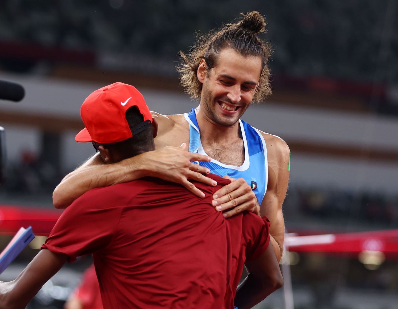 1日に行われた東京五輪の男子走り高跳び決勝は、カタールとイタリアの2選手が大会運営側と協議の上、ともに金メダルを獲得した。写真はカタールのムタズエサ・バルシム(手前)とイタリアのジャンマルコ・タンベリ。8月1日、東京で撮影(2021年 ロイター/Kai Pfaffenbach)