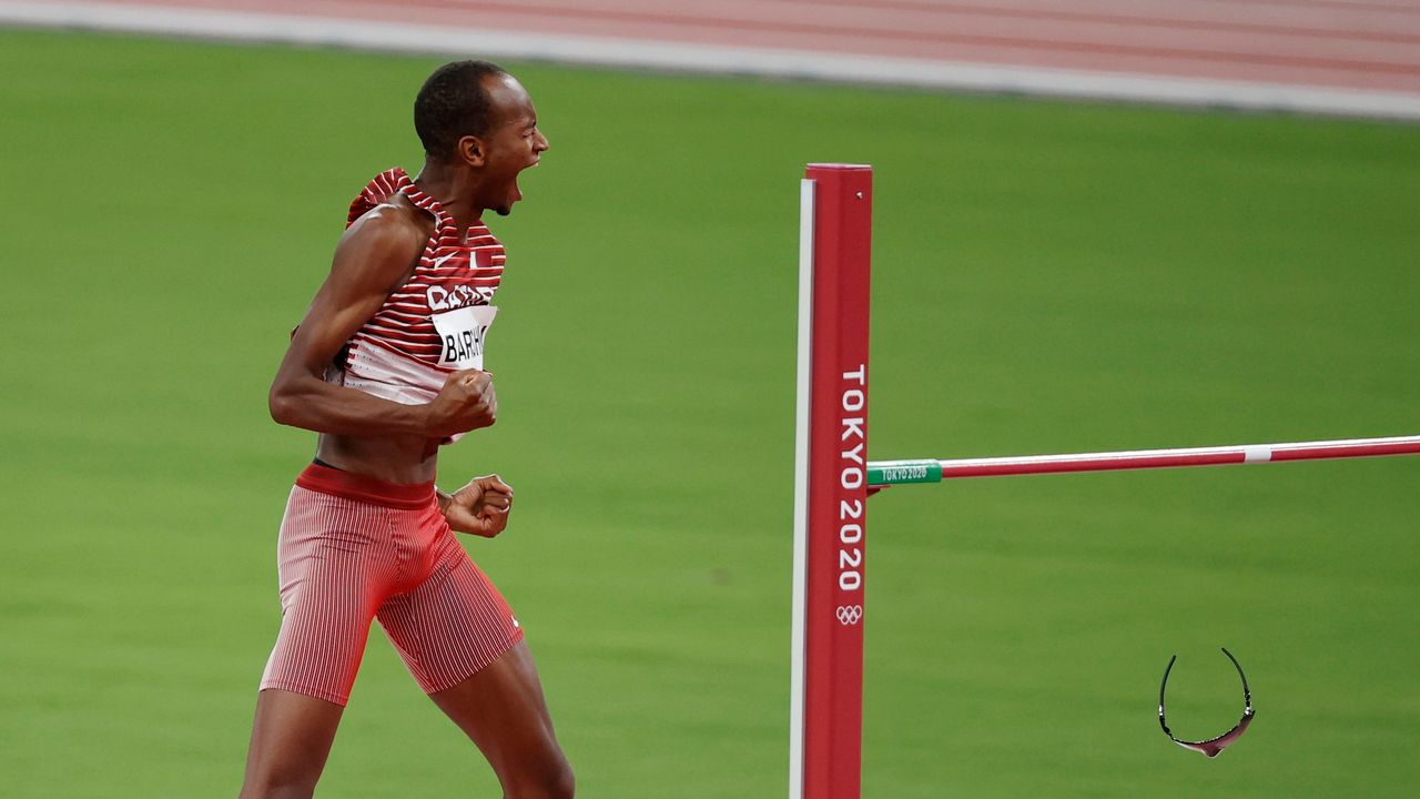 1日に行われた東京五輪の男子走り高跳び決勝は、カタールとイタリアの2選手が大会運営側と協議の上、ともに金メダルを獲得した。写真はカタールのムタズエサ・バルシムリ。8月1日、東京で撮影(2021年 ロイター/Phil Noble)