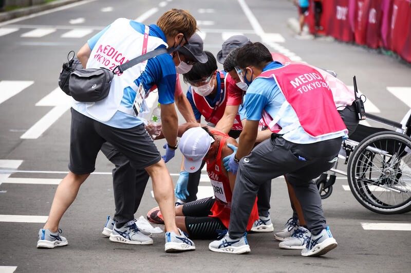 東京五輪のマラソンは東京の暑さを回避するため札幌市に会場が変更されたが、この日の気温は午前8時ごろの時点で26.5度、湿度は75%。106人中30人が途中棄権した。写真はゴール後に倒れ込んだ日本の服部勇馬。8月8日、北海道札幌市で撮影(2021年 ロイターREUTERS/Kim Hong-Ji)