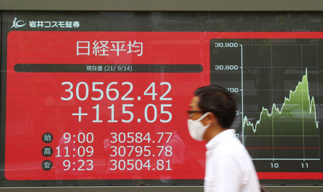9月14日、東京株式市場で日経平均は、3日続伸した。2月16日につけた終値ベースでの年初来高値(3万0467円75銭)を上回った。都内で撮影(2021年 時事通信)