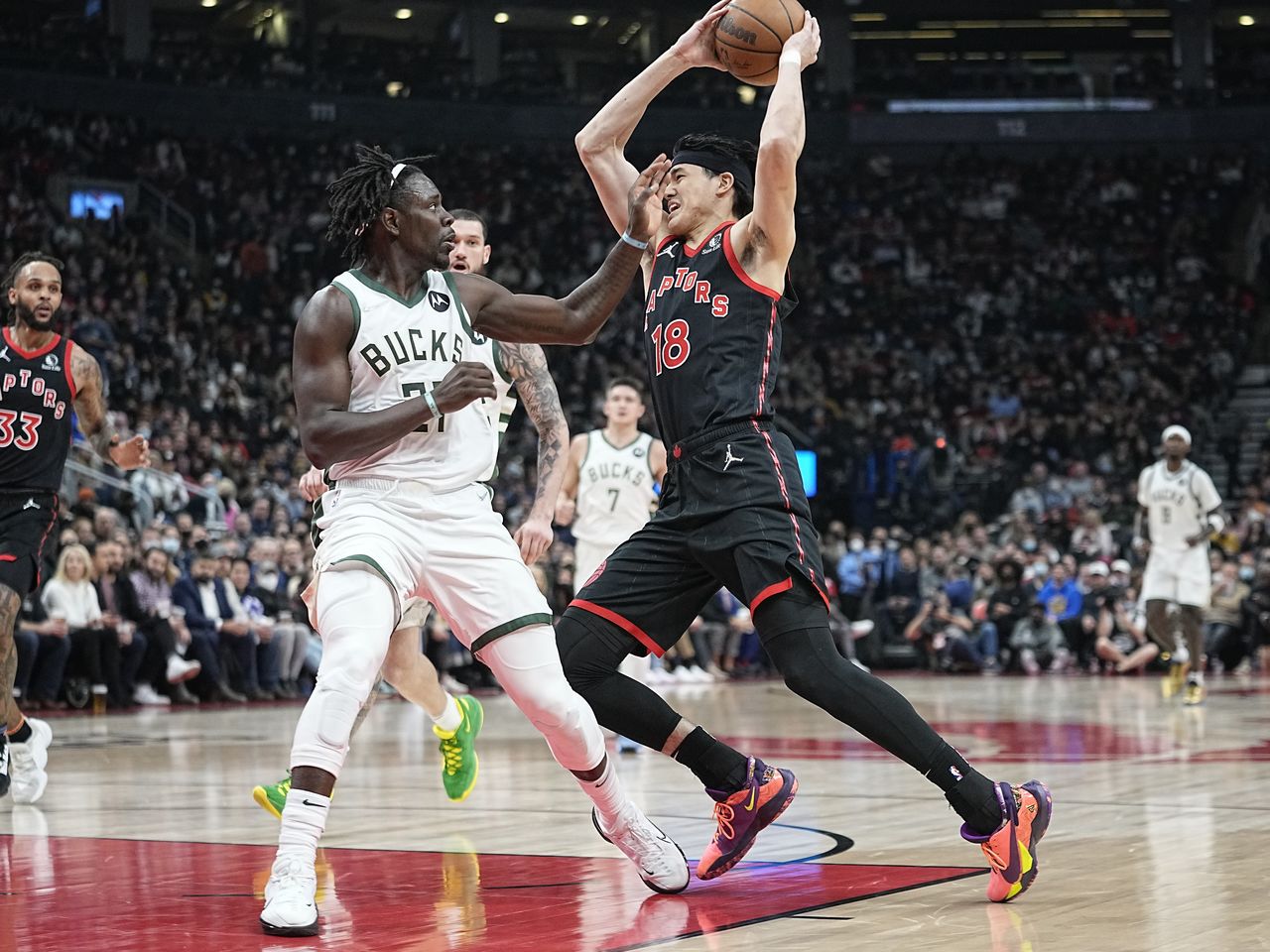 NBAで渡辺雄太(右)の所属するラプターズはバックスに97─93で競り勝った(2021年 ロイター/John E. Sokolowski-USA TODAY Sports)