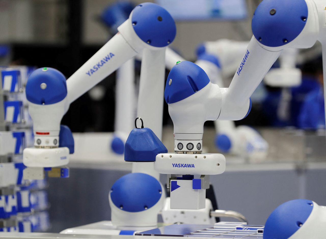 1月11日、安川電機は、2022年2月期の連結営業利益(国際会計基準)見通しを580億円と従来計画から据え置いた。写真は2019年12月、都内で開かれた国際ロボット展に出展れた安川電機のロボットアーム(2022年 ロイター/Kim Kyung-Hoon)
