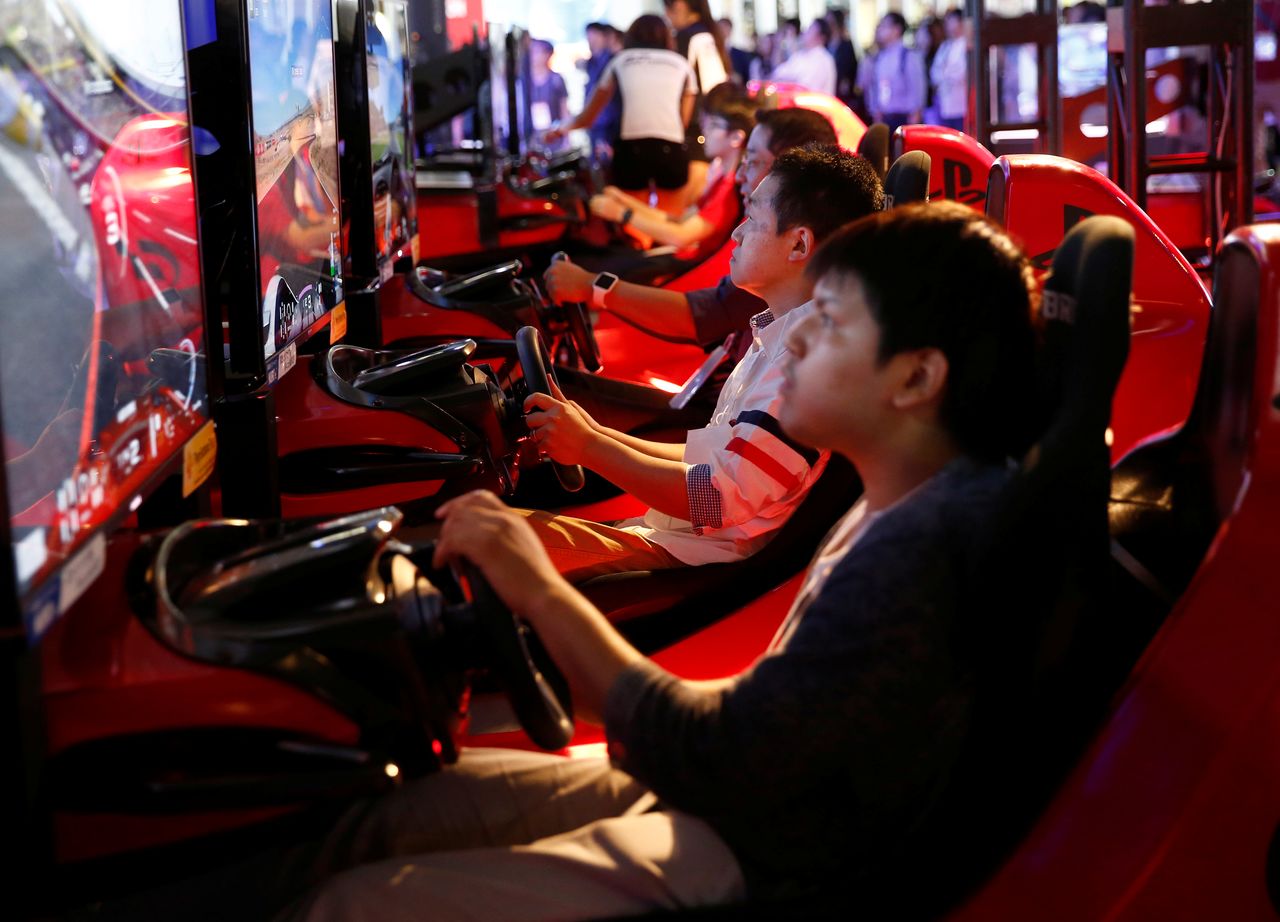 2月9日、ソニーグループは自動車レースゲーム「グランツーリスモ(GT)」向けに人工知能(AI)によるドライバーを開発し、世界トップレベルのゲーマーに勝利したと発表した。写真は東京ゲームショウでGTをプレーする人々、2017年9月撮影(2022年 ロイター/Kim Kyung-Hoon)