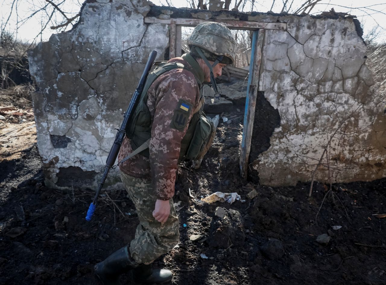ウクライナ政府軍の兵士。2月19日、東部ドネツクで撮影(2022年 ロイター/Gleb Garanich)