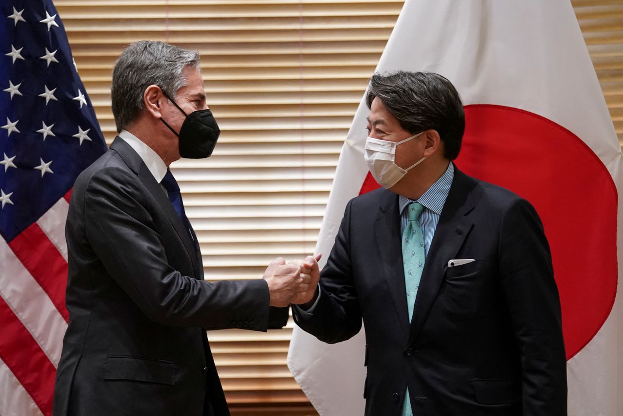 2月26日、林芳正外相(写真右)は米国のブリンケン国務長官(同左)と電話会談し、緊迫度が増すウクライナ情勢について意見交換した。豪メルボルンで11日代表撮影(2022年 ロイター)