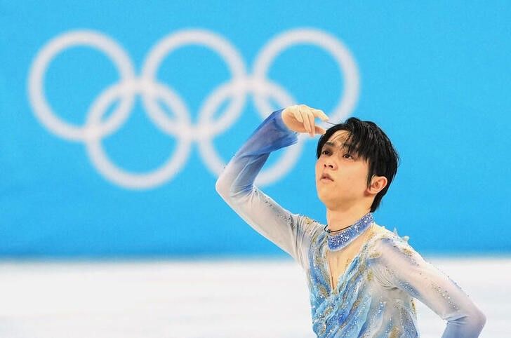 日本スケート連盟は1日、冬季五輪を2大会制したフィギュアスケート男子の羽生結弦が北京冬季五輪で痛めた足首のけがが回復していないため、世界選手権を欠場すると発表した。北京で2月撮影(2022年 ロイター/Aleksandra Szmigiel)