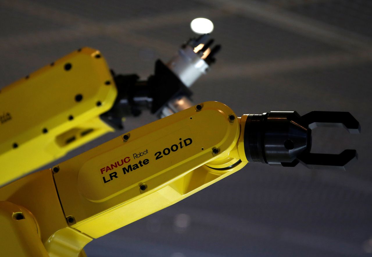 3月9日、日本工作機械工業会が発表した2月の工作機械受注(速報値)は前年比31.6%増の1389億9800万円だった。写真はファナックのロボット。2016年3月、成田空港で撮影(2022年 ロイター/Yuya Shino)