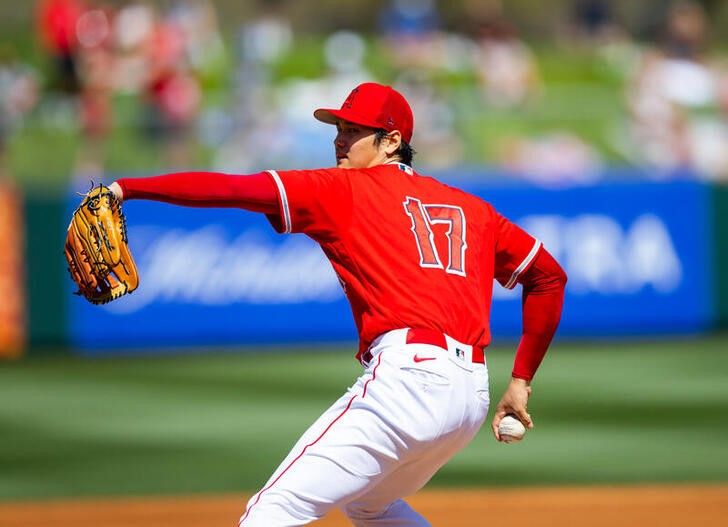 MLBエンゼルスの大谷翔平選手(写真)が開幕投手に指名された。同チームのジョー・マドン監督が25日に発表した。米アリゾナ州テンピで21日撮影(2022年 ロイター/USA TODAY Sports)