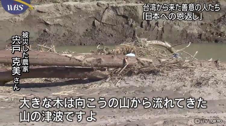 被災した農家の宍戸克美さんは「大きな木は向こうの山から流れてきました。山の津波です」と被害の状況を説明。その被害の大きさに陳さんも言葉を失う。