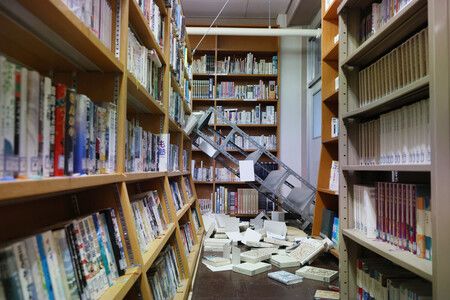 地震で棚が倒れ、本が散乱した八戸西高校の図書室=9日午後、青森県八戸市