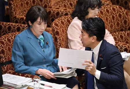参院予算委員会で小泉進次郎防衛相(右手前)と話し合う高市早苗首相=16日午前、国会内