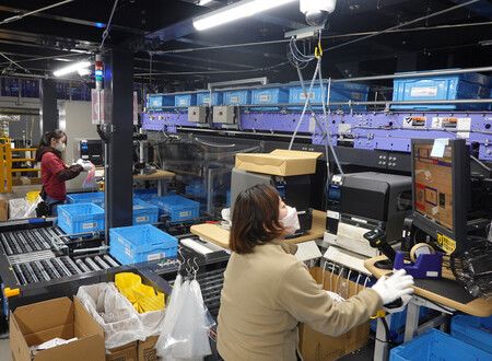 アスクルの物流センターで、発送する商品を仕分けするスタッフ=17日、東京都江戸川区