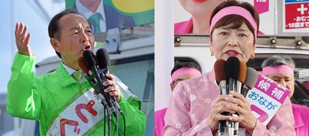 沖縄県名護市長選が告示され、第一声を上げる翁長久美子氏(写真右)と渡具知武豊氏=18日午前、同市