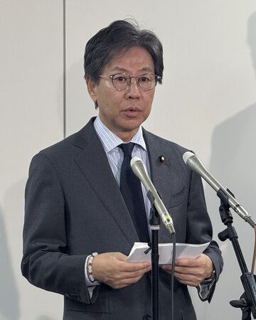 新党「中道改革連合」への立憲民主党からの入党予定者について発表する安住淳立民幹事長=20日午前、東京・永田町の同党本部