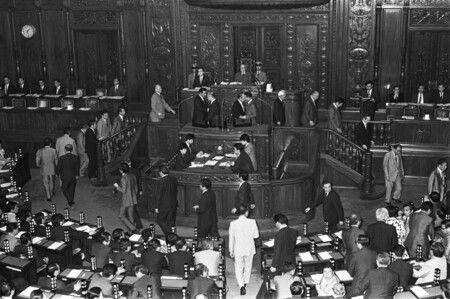 衆院本会議で、スパイ防止法案の記名投票を行う議員ら。賛成多数で継続審議となった=1985年6月、国会内