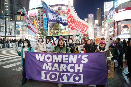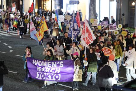 国際女性デーの8日、東京・渋谷で女性への性暴力や差別に反対するデモ行進「ウィメンズマーチ東京」が行われた。参加者は性差別反対などを訴えるプラカードや横断幕を手に、渋谷駅周辺を練り歩いた。同様の行進は福岡市や名古屋市など各地で実施された。