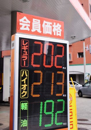 レギュラー価格202円を示すガソリンスタンドの価格看板=18日午後、山形市