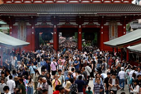 東京・浅草の浅草寺を訪れた外国人観光客=2025年5月、東京都台東区(EPA時事)