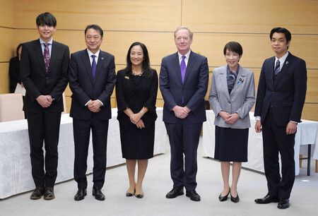 米マイクロソフト(MS)のブラッド・スミス社長(右から3人目)らの表敬を受ける高市早苗首相(同2人目)=3日、首相官邸